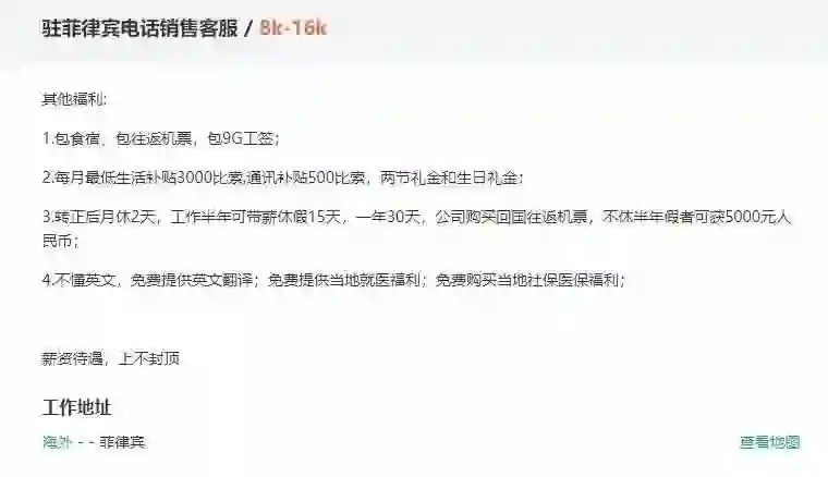 张天佑搜索发现,在百度贴吧、菠菜帮社区甚至部分招聘网站确实有这类职位,于是在群友的推荐下,选定了一家位于菲律宾首都马尼拉的公司,简单收拾后就按照安排上路了。