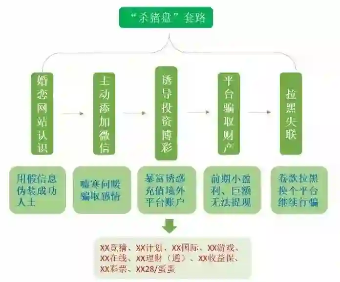 所谓杀猪盘,是一种新兴起的东南亚博彩(俗称菠菜)网站的骗局,利用很多人急于找对象的心理,骗子先以谈恋爱为名接近,此时落入陷阱的大龄男女被骗子们当作待宰割的“猪”,平日里的嘘寒问暖、谈情说爱是骗子们口中的“养猪”,目的是为了取得信任,为下一步“杀猪”做准备。等到时机成熟,骗子们便会以虚假网络赌博为借口,骗取被害人的钱财。