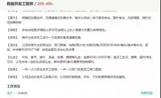 截至4月26日,打开拉勾网时,全天候科技发现上面依然有大量海外招聘的岗位,工作地点大部分都在菲律宾马尼拉大都会,甚至会注明是在马卡蒂市(Makati),这是博彩网站聚集之地。