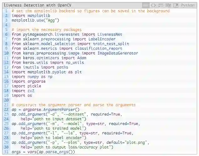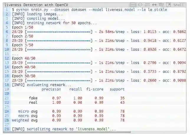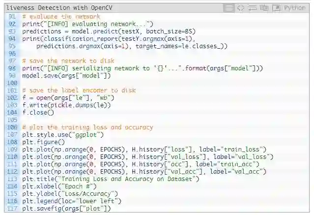 2. train_liveness.py:如文件名所示,这个脚本用来训练 LivenessNet 分类器。我们将用 Keras 和 TensorFlow 训练模型。在训练过程中会产生一些文件: