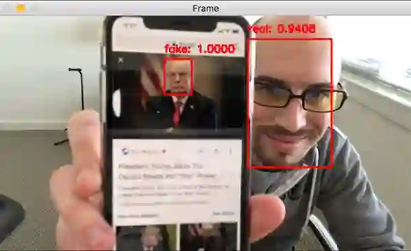 在这里可以看到我们的活性检测器成功地分辨出真实面部和伪造面部。