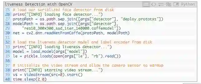 34 和 35 行加载序列化的预训练模型(LivenessNet)和标签编码器。