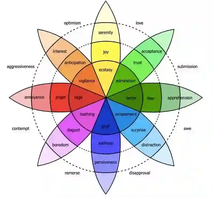 罗伯特·普拉奇克(Robert Plutchik)将基本情绪扩充为八种,为各种情绪较弱和较强的变种命名,得到了这个惊人而多彩的图表。实际上,有无穷无尽的次级情绪,比如羞耻、愧疚、感恩、宽恕、报复心、自傲、羡慕、信任、希望、后悔、孤独、挫败感、激动、尴尬、失望等等,它们并非基本情绪的简单混合,而是挂接到多个客体与因素混杂的社交情景上的情绪。