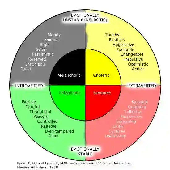 在近代,汉斯·艾森克(Hans Eysenck)发展了这套分类方法,他的版本(画得五彩斑斓)在这里: