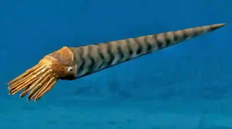 现在我们发现了最早的拥有脊髓的脊椎动物。但我们也能找到最早的拥有外骨骼的节肢动物,还有最早的头足类,这些头足类是软体动物门的猎手,长有一圈触手,当时有着长锥型的贝壳(下图是之后在奥陶纪出现的头足类动物直角石的重建影像)。所有三个门类都拥有意识存在的严肃论据。