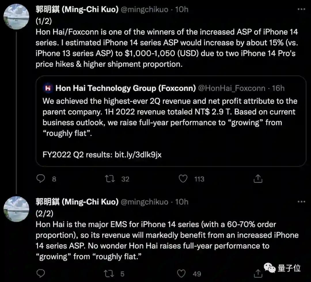 此次涨价的主要原因是iPhone14Pro价格的上涨和出货比例的提高。