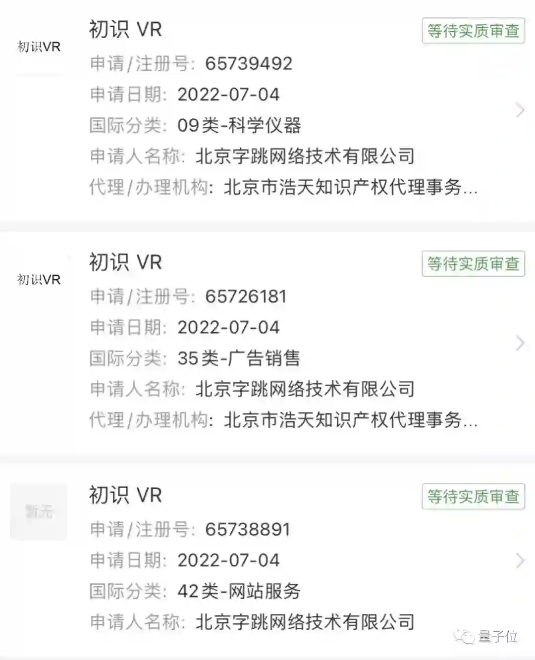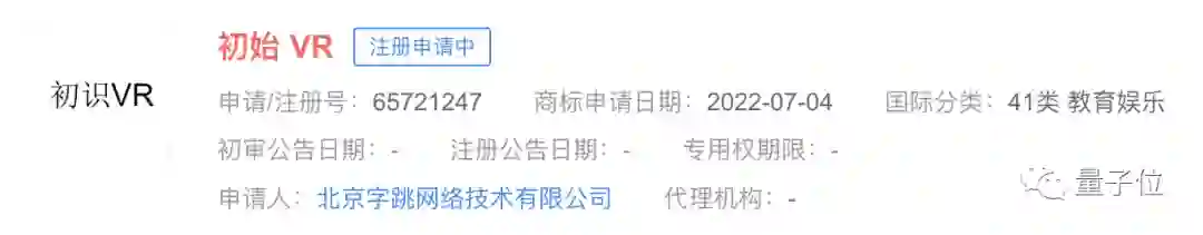 天眼查App显示,近日,北京字跳网络技术有限公司申请注册3枚“初识VR”商标,国际分类包括广告销售、科学仪器、网站服务。