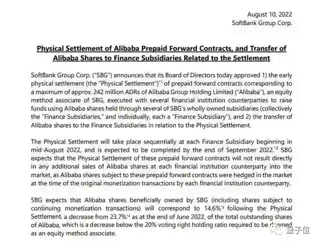 8月10日傍晚,软银集团发布公告,宣布将通过结算预付远期合约的方式,减持阿里巴巴。
