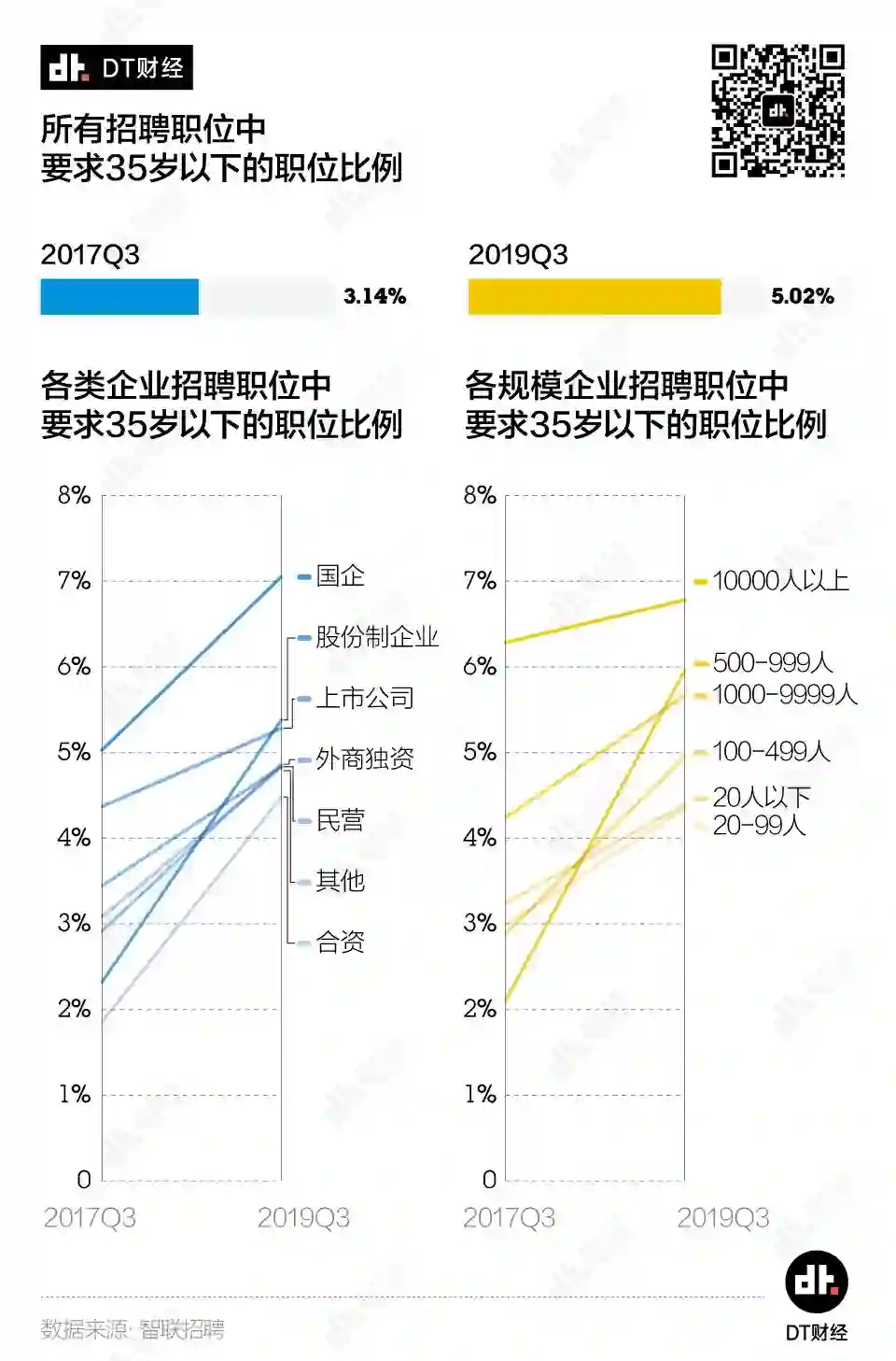 从招聘需求来看,2019年第三季度所有的招聘岗位中,只有5%明确要求求职者的年龄低于35岁。