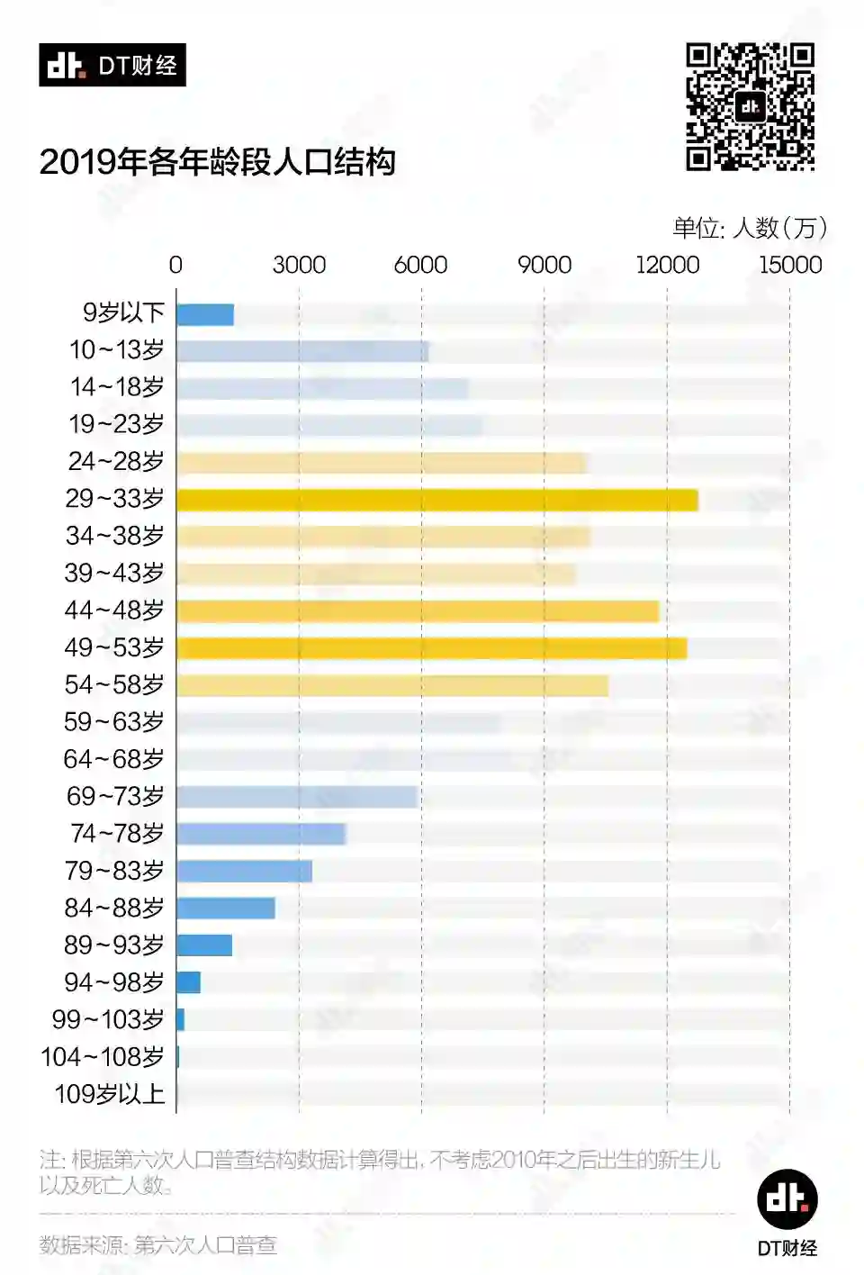 根据2010年国家第六次人口普查数据,到2019年我国34-43岁的中年人口数量为1.98亿,而44-53岁人口数量为2.42亿,24-33岁人口数量为2.27亿。