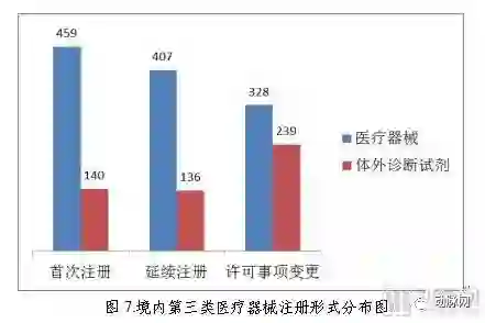 从注册形式看,首次注册599项,占全部境内第三类医疗器械注册数量的35.0%,延续注册543项,占全部境内第三类医疗器械注册数量的31.8%;许可事项变更注册567项,占全部境内第三类医疗器械注册数量的33.2%。注册形式分布情况见图7。