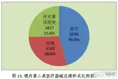 2018年,各省级药品监管部门共批准境内第二类医疗器械注册11062项,与2017年相比减少40.5%。其中首次注册5046项,占全部境内第二类医疗器械注册数量的45.6%;延续注册3189项,占全部境内第二类医疗器械注册数量的28.8%;许可事项变更注册2827项,占全部境内第二类医疗器械注册数量的25.6%。境内第二类医疗器械分项注册情况见图15。