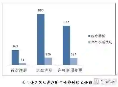 从注册形式看,首次注册294项,占全部进口第三类医疗器械注册申请数量的14.0%;延续注册1006项,占全部进口第三类医疗器械注册申请数量的47.9%;许可事项变更801项,占全部进口第三类医疗器械注册申请数量的38.1%。注册形式分布情况见图4。
