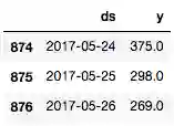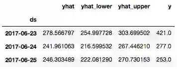 return forecast.set_index('ds')[['yhat', 'yhat_lower', 'yhat_upper']].join(historical.set_index('ds'))
