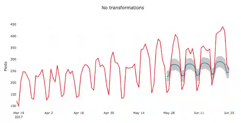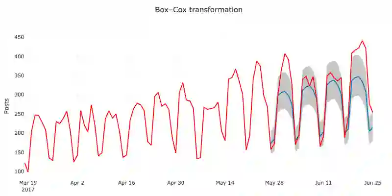 目前为止,我们使用的都是Prophet的默认设置,数据也基本上是原始数据。我们这里不打算讨论如何调整模型的参数,不过,即使在不动默认参数的情况下,还是有提升的空间。在这一节,我们将在原始时序上应用Box-Cox变换,看看会有什么效果。