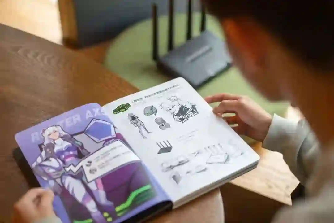 其中 Redmi 电竞路由器 AX5400 在笔记本插画中的描述是这样的:“一位好胜心极强的竞速少女,决不允许落后于人”,她的两项绝招分别是: