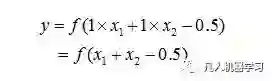 (2)类似地,“或(x1∨x2)”:当w1=w2=1,阈值θ=0.5时,有: