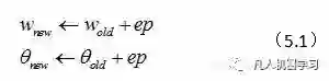 现在,我们把ep的值带入公式(5.1)所示的规则中,更新网络的权值和阈值,即: