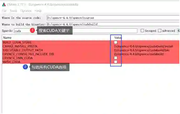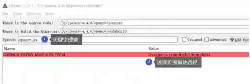 这些内容都在OpenCV的扩展模块中,想要获取这OpenCV CUDA的支持,必须首先编译OpenCV CUDA相关的模块,这里主要是开展模块以CUDA开头的那些。