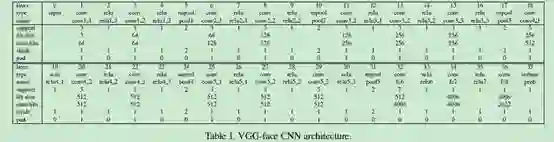 2.深度特征:CNN,由于亲属识别数据集比较小,神经网络模型需要大量的训练数据,所以我们采用预训练的方法通过VGG-face network提取深度特征, VGG-facenetwork是用大量的人脸识别的图像训练出来的一个模型,接收224*224像素的图像输入,通过13个卷积层+relu,mpool,fc层产生一个4096维的向量以便我们可以有效利用。网络结构如下,实验中将视频一帧一帧的送入网络提取深度特征,最后对所有帧的图像特征求平均得到最终的人脸深度特征属性。