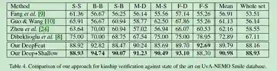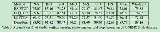 目前多数的亲属识别方法还停留在传统的从静态的图片中提取浅层手动设计的特征,这篇文章的贡献点有以下两个方面:1.将问题从时空角度出发进行考虑 2.将浅层的时空纹理特征与一些深度特征相融合。实验证明以上两个方面在UvA-NEMOSmile database上都可以有效提高亲属识别的准确率。