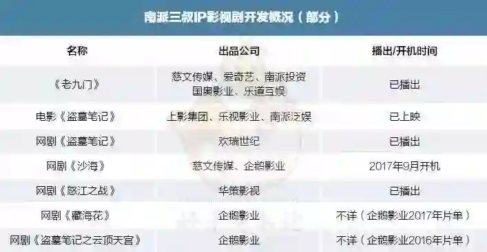 南派泛娱创建的首要目的在于南派三叔需将自己的作品版权掌控在手,并对其进行影视剧、舞台剧、游戏、漫画等一系列改编运作,扩充价值收益。除了《盗墓笔记》之外,南派泛娱旗下还有《沙海》《藏海花》《老九门》三个盗墓IP,以及《怒江之战》、《大漠苍狼》等(点击蓝字回顾),虽然这些作品的衍生开发难以达到《盗墓笔记》的高度,但其价值已不容小觑。