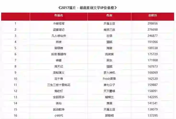 作为盗墓题材的先入者,在很长时间内,天下霸唱的小说《鬼吹灯》都领先于南派三叔的《盗墓笔记》。但《盗墓笔记》的IP价值已经后来居上。根据《2017猫片·胡润原创文学IP价值榜》,《盗墓笔记》位列第2,而《鬼吹灯》并未进入前10。在2017作家富豪榜上,三叔的版税排名也更为靠前。