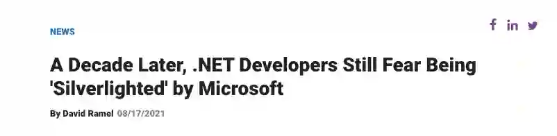 之后,开发者对微软的不信任感逐渐深入到骨髓,一直非常担心会再次遭受 Silverlight 这样突然被淘汰的事情。