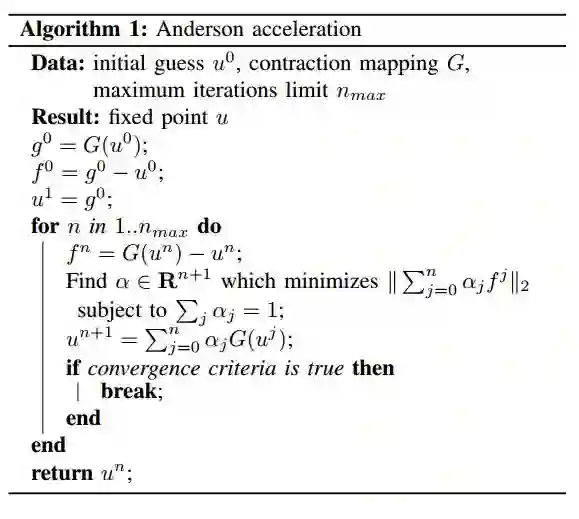图2:Anderson acceleration算法流程。从上述流程中可以看到第n+1次的结果不仅仅与第n次的结果相关,而且与前面计算出来的所有的结果相关,因此其结果具有“跳跃性”,从而可以使其更快速的收敛。