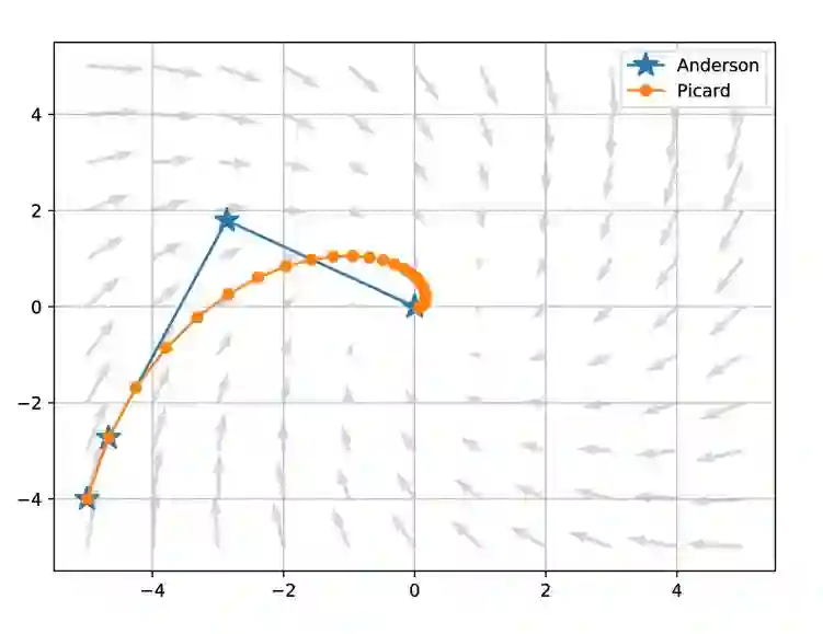 图1:对于二维映射G(u)=Au,Picard迭代与Anderson acceleration方法的对比。二者都是以(-5,-4)为起点迭代。星与圆都代表迭代点,灰色箭头代表在不同点的映射关系。