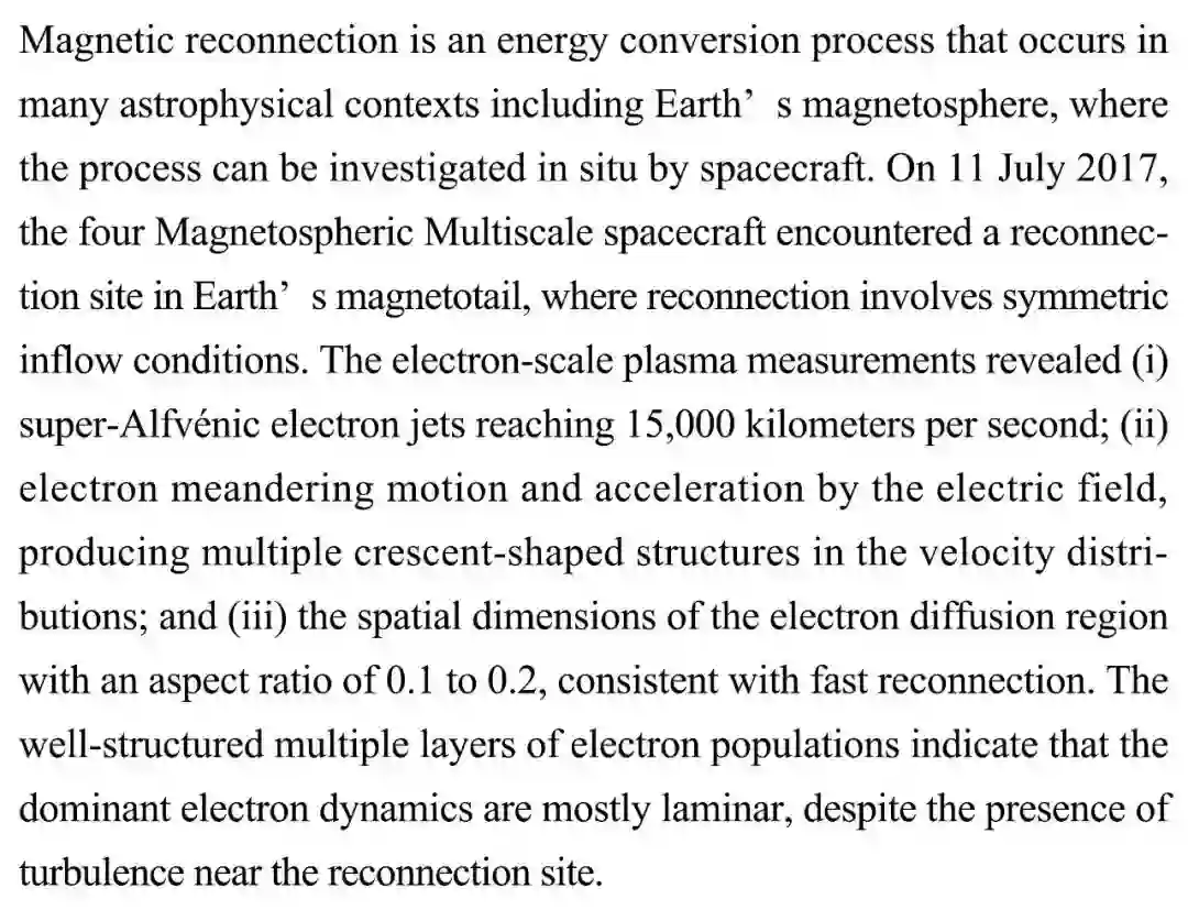 (导读 阿金)磁重联是发生在多种天体物理现象中的能量转换过程,包括地球磁层在内。2017年7月11日四个磁层多尺度航天器碰上了地球磁尾的重联位点。电子尺度下等离子体测量结果显示超级Alfvénic电子喷射、电子蜿蜒运动和加速以及电子扩散区域的空间尺度。结果表明即便在重联位点的附近存在湍流,主要的电子动力学行为具有层流特征。