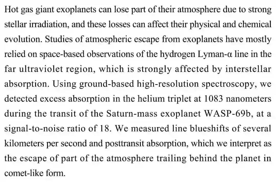 (导读 阿金)恒星强辐射导致巨型热气行星失去部分大气,从而影响其物理和化学演化。本研究使用地基高分辨率光谱,在一个质量相当于木星的系外行星WASP-69b凌日期间探测到1083纳米氦三重态的过度吸收。同时测量了每秒若干千米的线性蓝移和凌日后吸收,将其解释为拖在星球后面的大气部分逃逸现象。