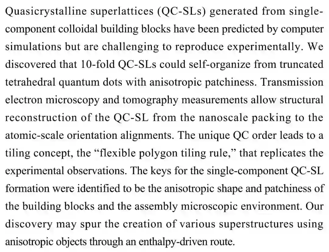 (导读 薛炜楠)计算证明准晶超晶格(QC-SL)可由单组分胶体构筑单元制备,但从实验上很难重复。本研究利用一种各向异性的四面体量子点,通过自组装制备具有10重对称性的QC-SL。该QC-SL可通过柔性多边形平铺规则进行结构重组。研究结果为通过各向异性的构筑单元制备不同超结构奠定了基础。