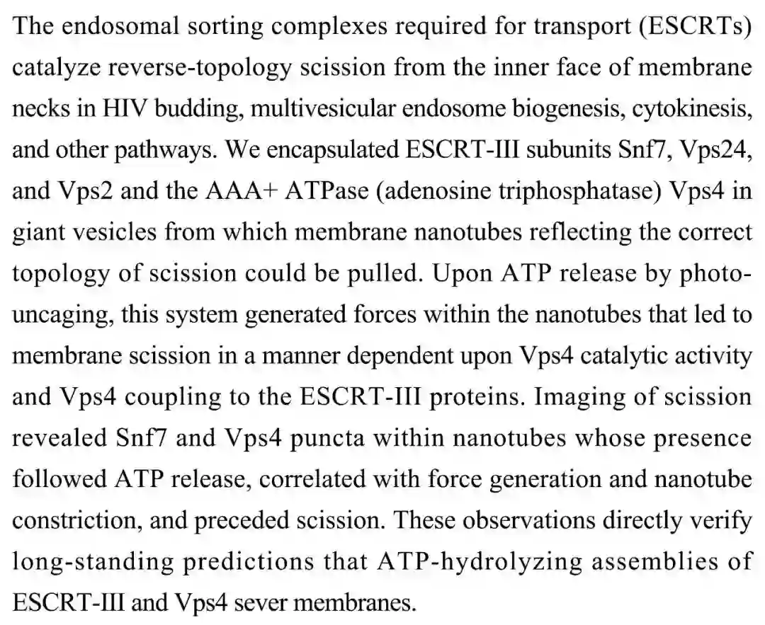 (导读 柳寒石)转运所需的内吞体分选复合物(ESCRT)催化HIV出芽等途径中膜颈内表面的逆向拓扑断裂。 研究发现包裹ESCRT-III亚基的大囊泡通过光解释放ATP时,在纳米管内产生导致膜断裂的力,其方式取决于Vps4催化活性和Vps4与ESCRT-III蛋白的偶联。 断裂成像揭示了纳米管内Snf7和Vps4点状突起与ATP释放以及力的产生和纳米管收缩的关系。 这些观察直接验证了长期以来的推测。