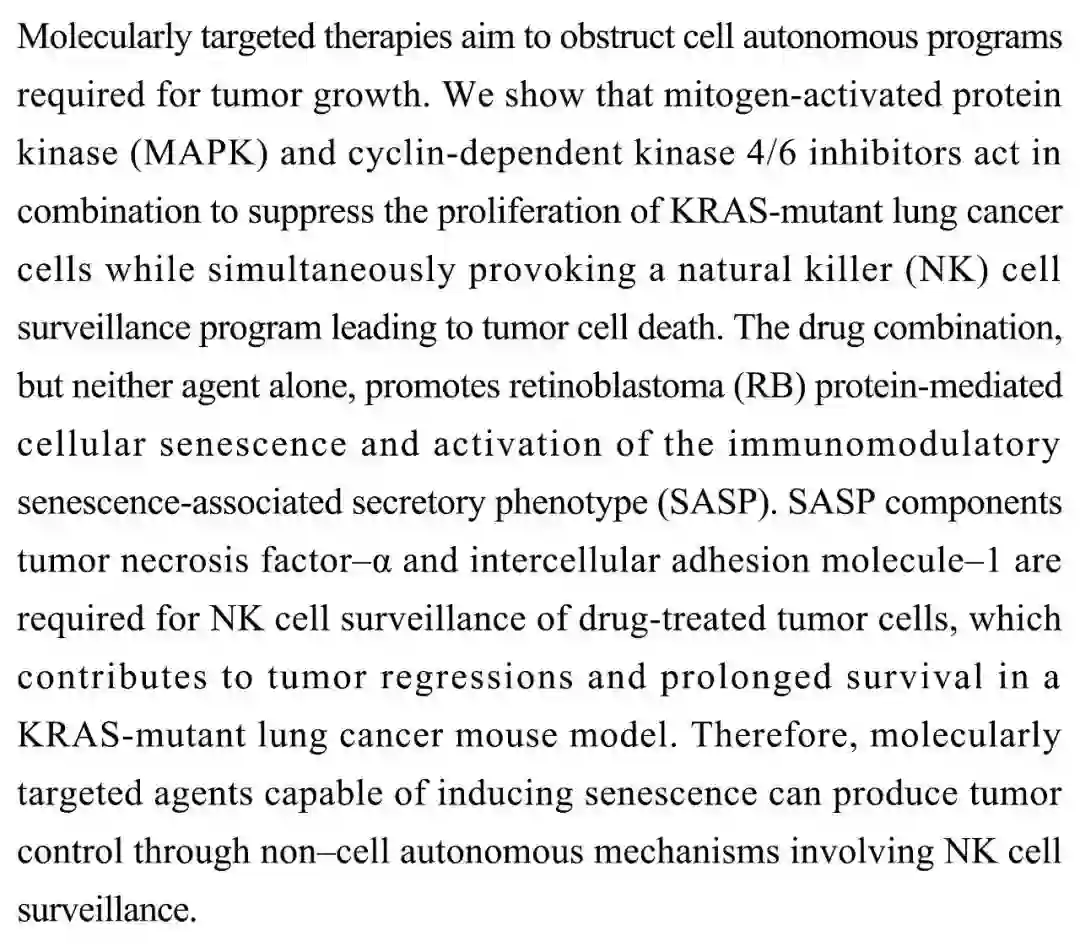 (导读 王思菲)本研究发现联合使用MAPK抑制剂及细胞周期蛋白依赖激酶4/6抑制剂可抑制KRAS突变的肺癌细胞增殖,同时启动自然杀伤细胞(NK)的监测程序导致癌细胞死亡。仅双药联用能提高RB蛋白介导的细胞衰老及激活免疫调节衰老相关分泌表型(SASP)。NK细胞的监测需要SASP中的TNF-α及胞间粘附分子-1,从而促进KRAS突变小鼠肺癌模型中肿瘤的消退并延长寿命。