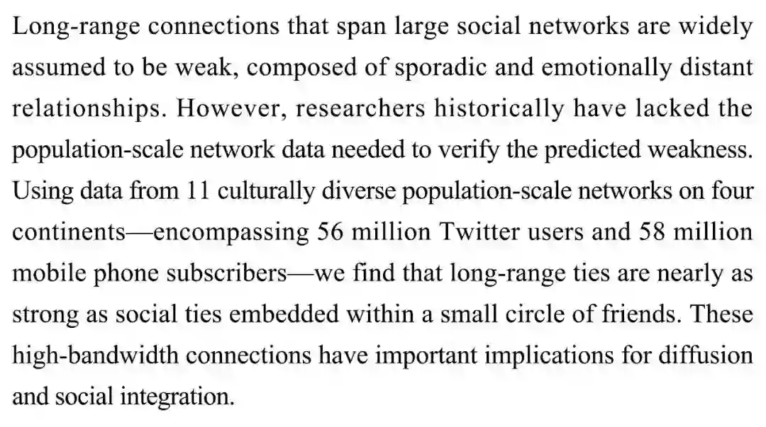 (导读 陈月欣) 大型社交网络中的远程关系曾被广泛认为是一种微弱的连结,但无研究证实。我们通过研究了4个大洲的11个不同文化的远距离大型社交网络后发现,人们在这种社交网络中建立起的社会连结强度几乎与小圈子内的相当。这一紧密连结对于人口的流动和社会融入有着重要影响。