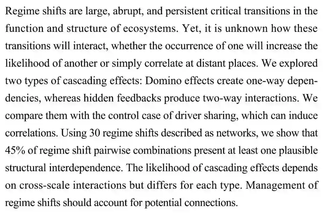 (导读 阿金)跃变是生态系统功能和结构中巨大、突然且持续的关键变化。目前尚不清楚这些变化的互作机制。本研究探讨了两种联级效应:单向的多米诺效应和隐藏反馈产生的双向互作。通过将30种跃变描述为网络结构,发现其中45%成对组合,表现出至少一种看似合理的结构相互依赖性。因此联级效应的发生的可能依赖跨尺度互作,但类型各异,跃变管理应该要考虑潜在的联系。