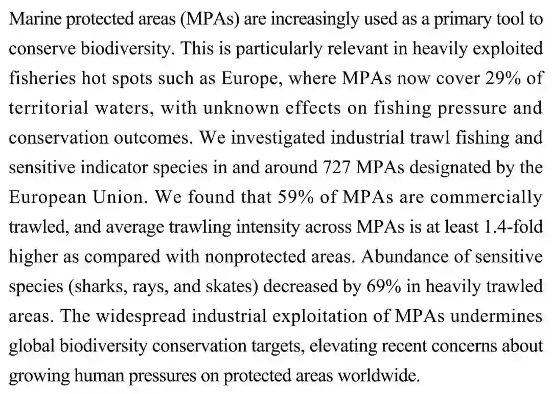 (导读 陈月欣) 海洋保护区是保护生物多样性的有效手段,但其对渔业和保护的影响尚不明确。我们对欧盟内727个保护区调查后发现,近六成保护区内有渔业拖网,而且保护区内拖网使用强度高于非保护区。密集的渔业拖网已经对于敏感鱼类种群数量造成影响,应当在全球范围内引起重视。