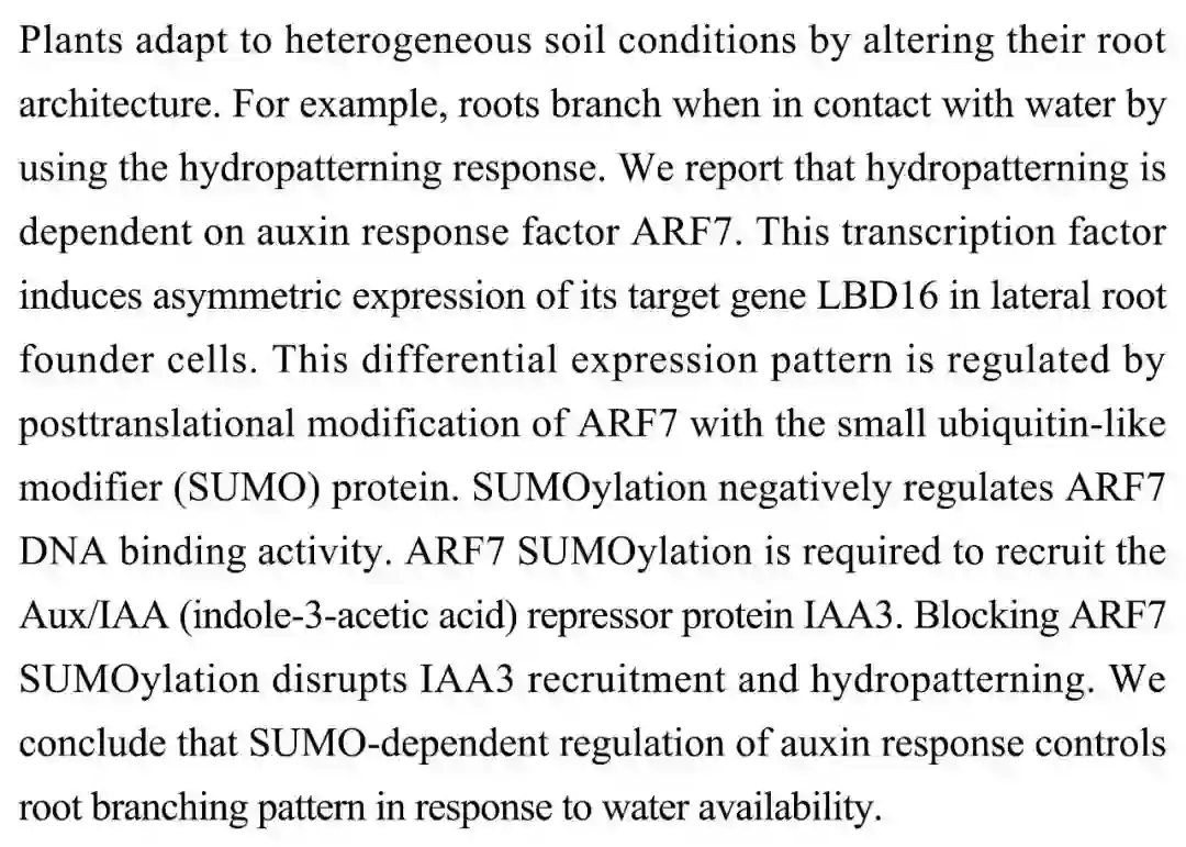 (导读 阿金)植物改变根系结构来适应不同的土壤条件。根系接触水时通过多水模式应答促进分支产生,这一过程依赖生长素应答因子ARF7。ARF7诱导侧根生成细胞中LBD16的不对称表达,该过程受到ARF7翻译后SUMO修饰的调控,SUMO修饰使ARF7 DNA结合能力下降并招募IAA3,抑制ARF7 SUMO修饰破坏IAA3招募和多水模式。该结果表明针对水的多少依赖SUMO修饰的生长素应答调节根系分支模式。