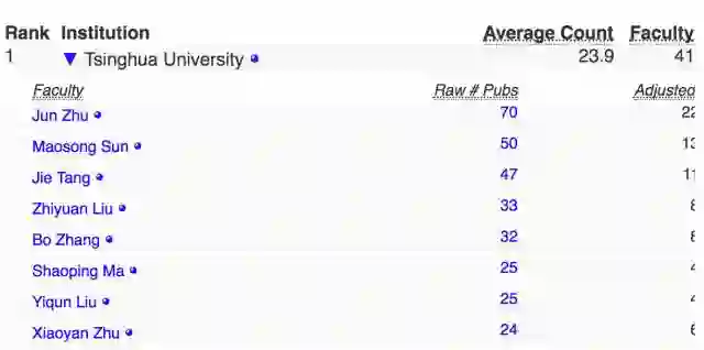 你可以通过勾选不同领域,查看各院校的排名。在各院校之下,你还可以展开查看师资力量。比如,我打开清华大学(只勾选了人工智能)的 Faculty,得到: