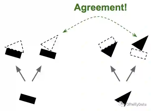 图5 按一致性路由。第一步——基于对象的部分是否存在和姿态来预测对象是否存在及其姿态,接着查看预测间的一致性。图片由Aurélien Géron提供。
