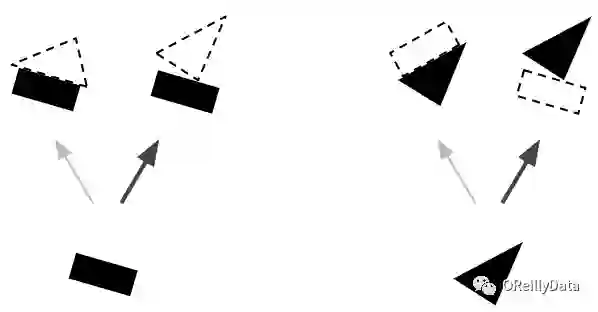 假设我们只有两个向量胶囊:一个识别矩形的胶囊和一个识别三角形的胶囊,而且假定他们都能检测到相应的形状。矩形和三角形可以是房子或是船的一部分(见图5)。根据矩形的姿态,它们都是稍微向右旋转了一点,那么房子和船也都会向右旋转了一点。