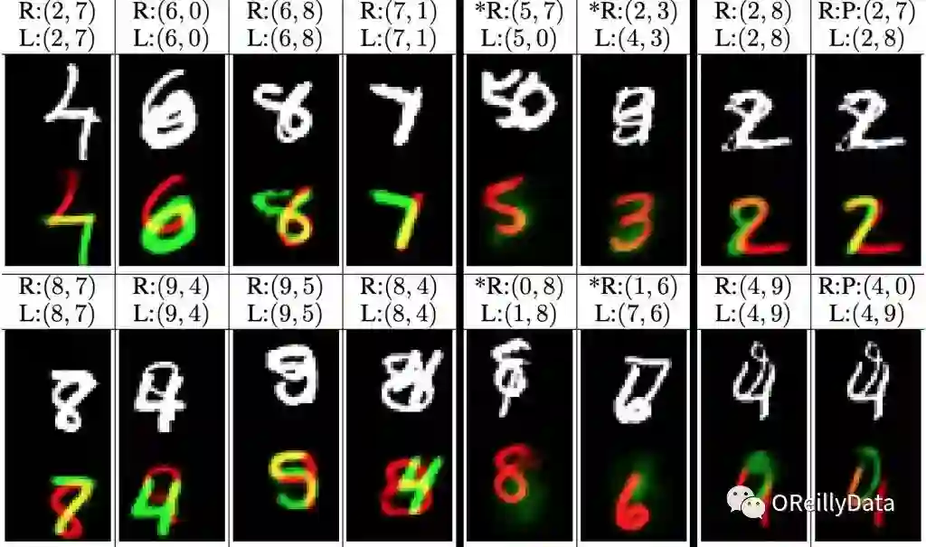 图3 MultiMNIST图片(白色)和由CapsNet重构后的结果(红色和绿色)。“R”=重构后的结果;“L”=标注。例如,对第一个样例(左上角)的预测是准确的,重构的结果也对。但是在第五个例子里,预测(5,7)是错的,不是(5,0)。因此,5被正确地重构了,但是0没有。图片来自论文《Dynamic routing between capsules》,作者友情授权使用。
