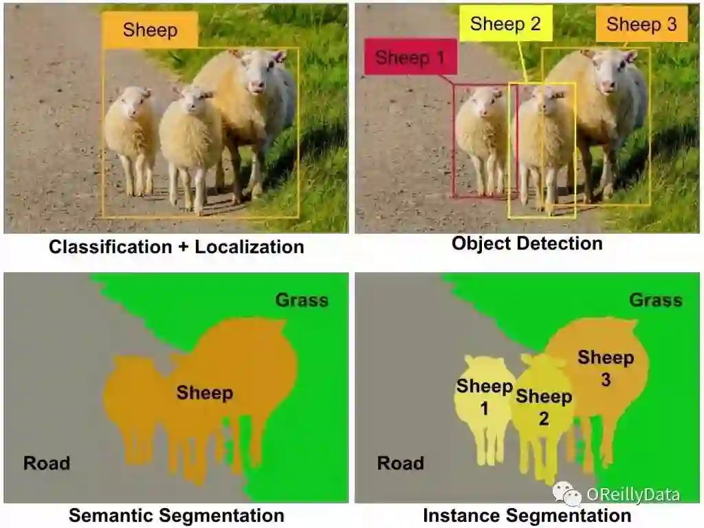 图1 一些主要的计算机视觉任务。当前,每种任务都需要一个不一样的CNN架构。比如分类里的ResNet,物体检测里的YOLO,实例分割里的Mask R-CNN等。图片由Aurélien Géron提供。