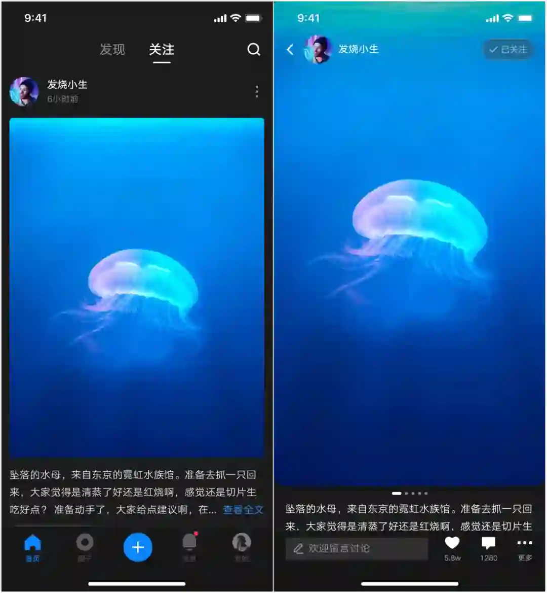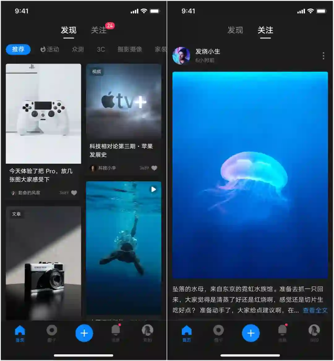 首页分为发现、关注(动态)Tab;