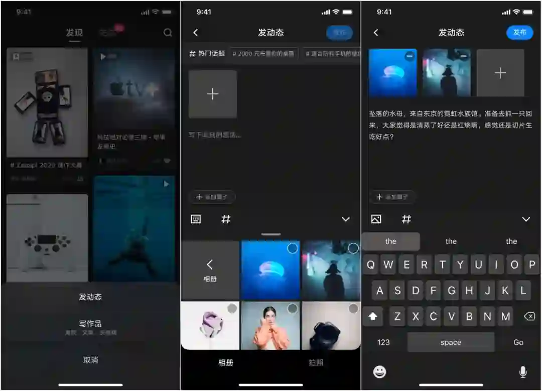 点击「+」号,选择 发动态,可以进入动态发布页面;