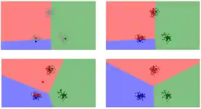 你可以像读漫画一样理解。平面上的每个数据点都根据离自己最近的重心加了颜色。你可以看到这些重心(更大一点的蓝点、红点和绿点)一开始是随机的,然后很快进行了调整,得到了它们各自的聚类。
