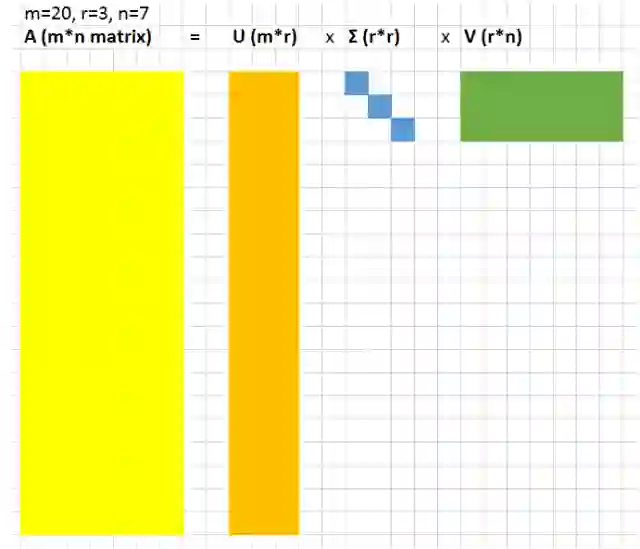 假设我们将我们的数据表示成一个 A=m×n 的大型矩阵。SVD 让我们可以将这个大型矩阵分解成 3 个较小的矩阵的乘积;这 3 个矩阵分别是 U=m x r、对角矩阵 Σ=r x r、V=r x n,其中 r 是一个很小的值。