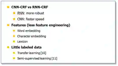 最后进行一下总结,目前将神经网络与CRF模型相结合的NN/CNN/RNN-CRF模型成为了目前NER的主流模型。我认为对于CNN与RNN,并没有谁占据绝对的优势,各自有相应的优点。由于RNN有天然的序列结构,所以RNN-CRF使用更为广泛。基于神经网络结构的NER方法,继承了深度学习方法的优点,无需大量人工特征。只需词向量和字符向量就能达到主流水平,加入高质量的词典特征能够进一步提升效果。对于少量标注训练集问题,迁移学习,半监督学习应该是未来研究的重点。