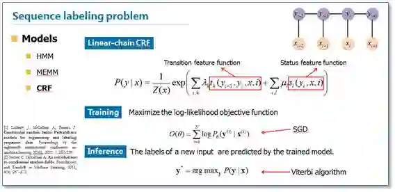 在传统机器学习中,条件随机场(Conditional Random Field,CRF)是NER目前的主流模型。它的目标函数不仅考虑输入的状态特征函数,而且还包含了标签转移特征函数。在训练时可以使用SGD学习模型参数。在已知模型时,给输入序列求预测输出序列即求使目标函数最大化的最优序列,是一个动态规划问题,可以使用维特比算法进行解码。